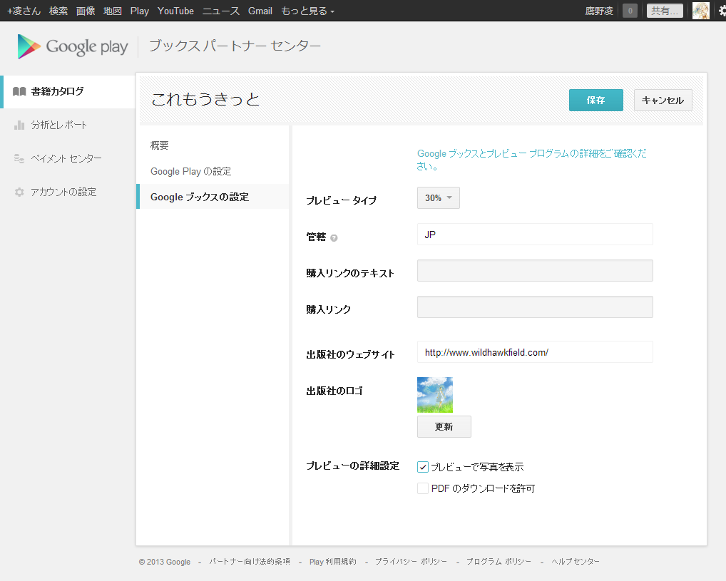 これは「Google ブックス プレビュープログラム」の設定です。プレビュープログラムとは、「出版社や著者が、Google ブックスを利用して書籍をオンラインで宣伝できる、無料のマーケティング プログラム」です。
