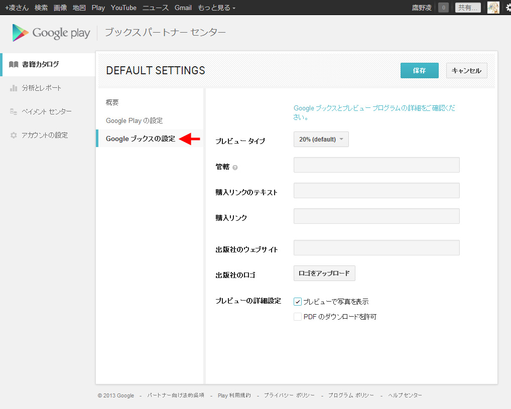 左のメニューから、[Google ブックスの設定]をクリックします。