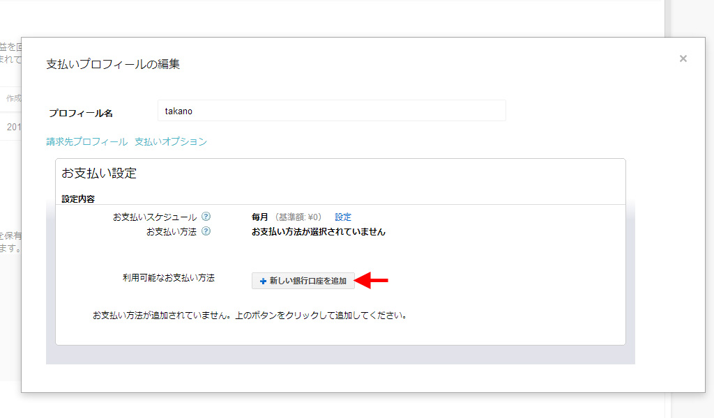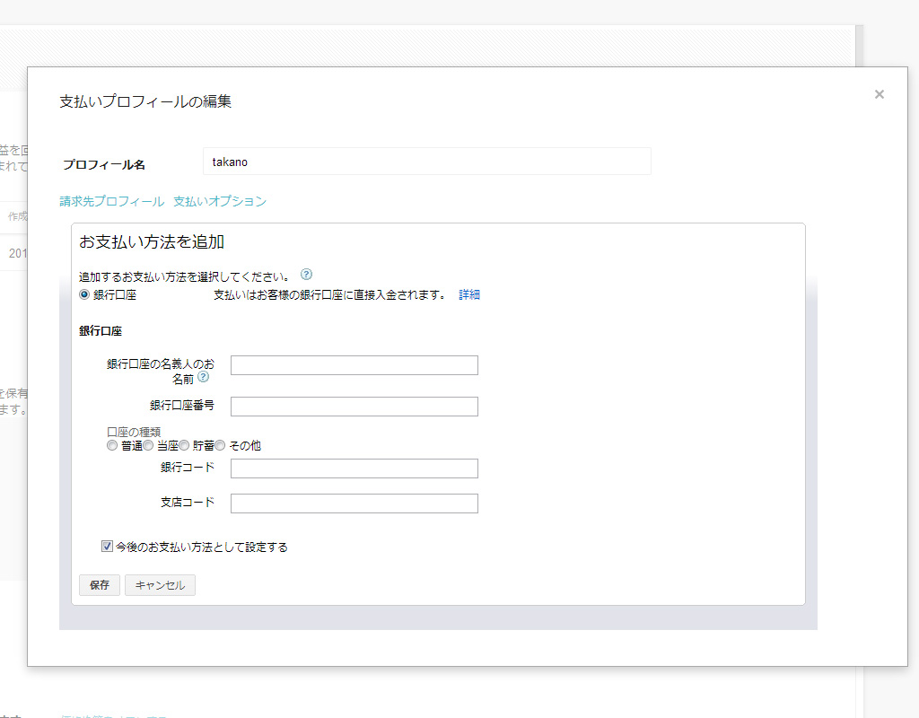 [+ペイメント プロフィールの追加]をクリックすると、下図のような入力画面が出ます。入力画面がちゃんと表示されない場合は、ブラウザのキャッシュとCookieをクリアしましょう(筆者はここで10日間足止めを喰らいました)。