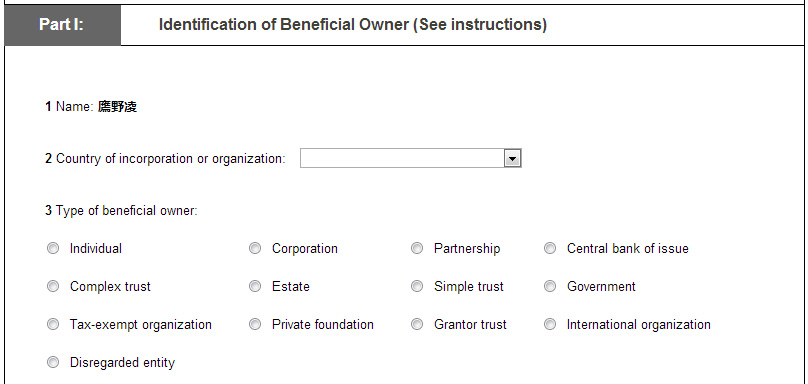 次の質問は「あなたのビジネス状況に最もぴったり合うものを選択して下さい」です。Corporation(法人)、Tax-exempt entity(免税事業者)、Intermediary(仲介業者)ではないので、「Foreign Individual(外国の個人)」を選択します。