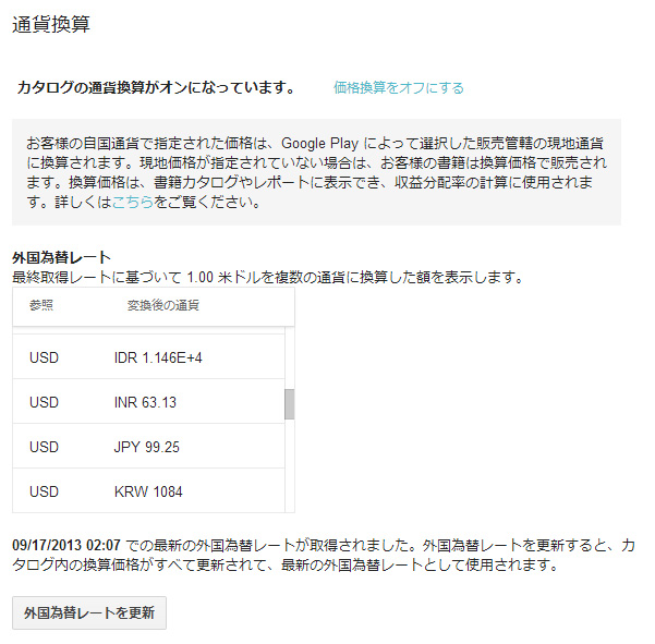 日本以外でも販売をする場合の、為替レート換算を自動で行うかどうかの設定です。ここはオンのままでいいでしょう。個々の書籍の販売管轄設定をする際に、自動でその国の通貨に換算してくれます。