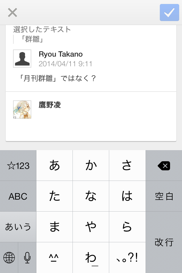 これで、選択範囲にコメントを付けられる入力画面になります。コメントへの返信と同様に、入力が完了したら右上のチェックマークアイコンをタップして下さい。
