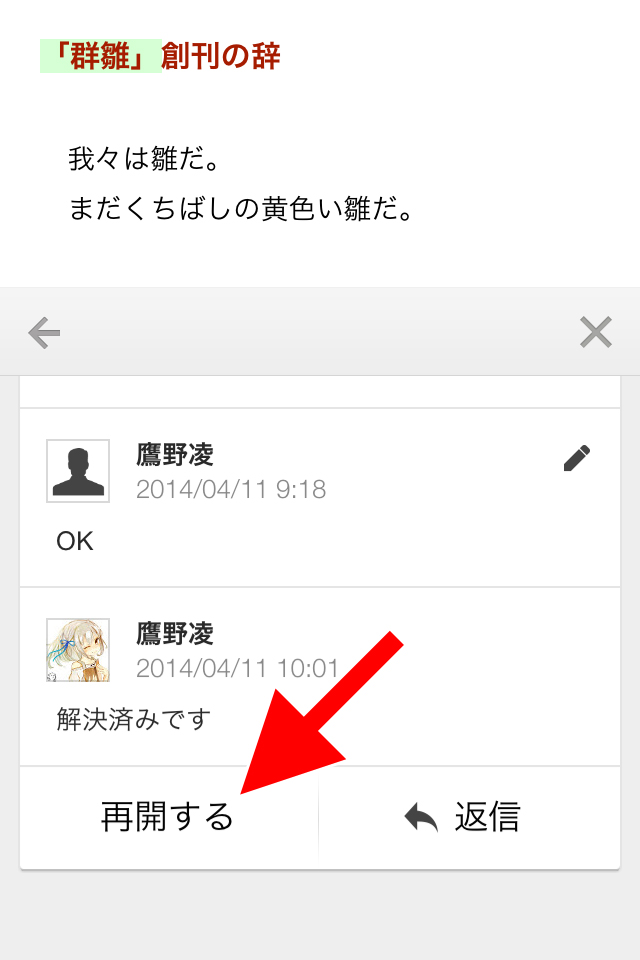 コメントをタップすると、下図のように[解決]と[返信]のボタンが表示されます。[解決]ではなく[返信]をタップして下さい。[解決]は、編集長が修正を反映した後に利用します。