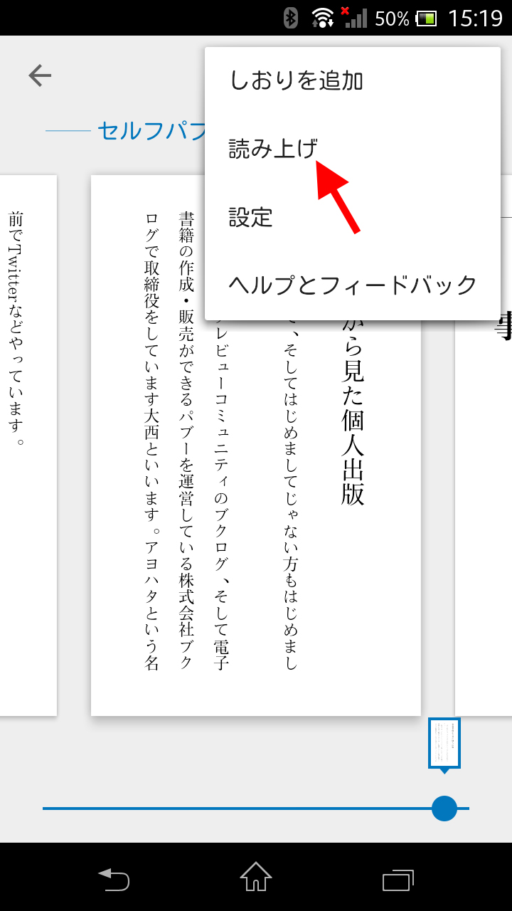 画面中央タップで読書メニューが開きます。文字の大きさや行間・配色の変更、サムネイル表示からの高速ページ移動、目次での移動、検索などができます。