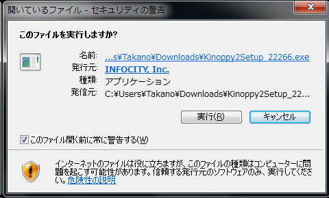 ダウンロードしたファイル(インストーラー)「Kinoppy2Setup_xxxxx.exe」を開きます。xはバージョン番号です。